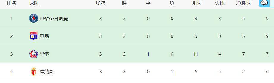 新赛季法甲联赛已经进行了3轮,大巴黎圣日尔曼表现依旧稳健,取得了3战全胜的成绩,积累了9分,目前暂时领先于积分榜首位。然而,他们的领先位置却并不牢固,和他们同样拿到9分的里昂队在积分榜上仅因净胜球少了3个而排在了大巴黎之后。