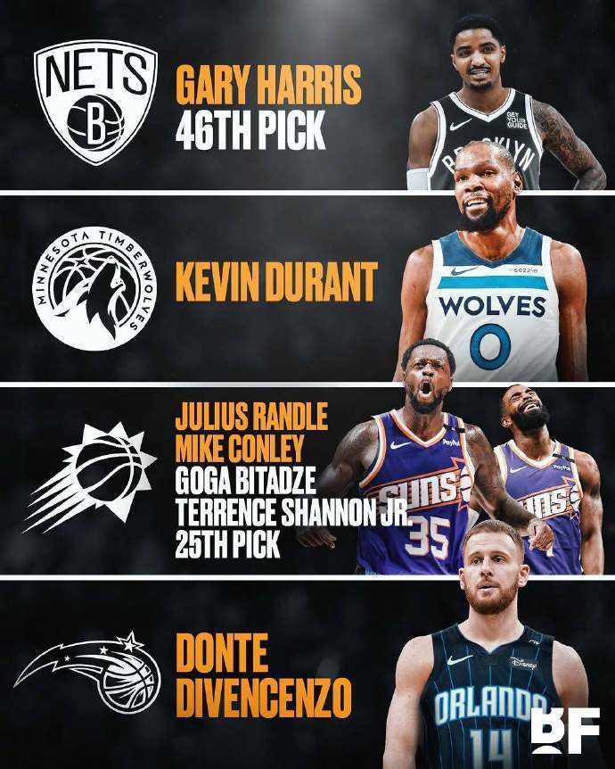 北京时间2025年6月11日,美媒构想了有关凯文-杜兰特的四方交易。具体如下:森林狼得到:杜兰特。太阳得到:兰德尔、康利、比塔泽、小香浓、25号签。篮网得到:加里-哈里斯、46号签。魔术得到:迪文琴佐。 根据最新报道,马刺是杜兰特的潜在下家热门, 而热火等队也即将加入争夺战。(搜狐体育编辑:JS)
